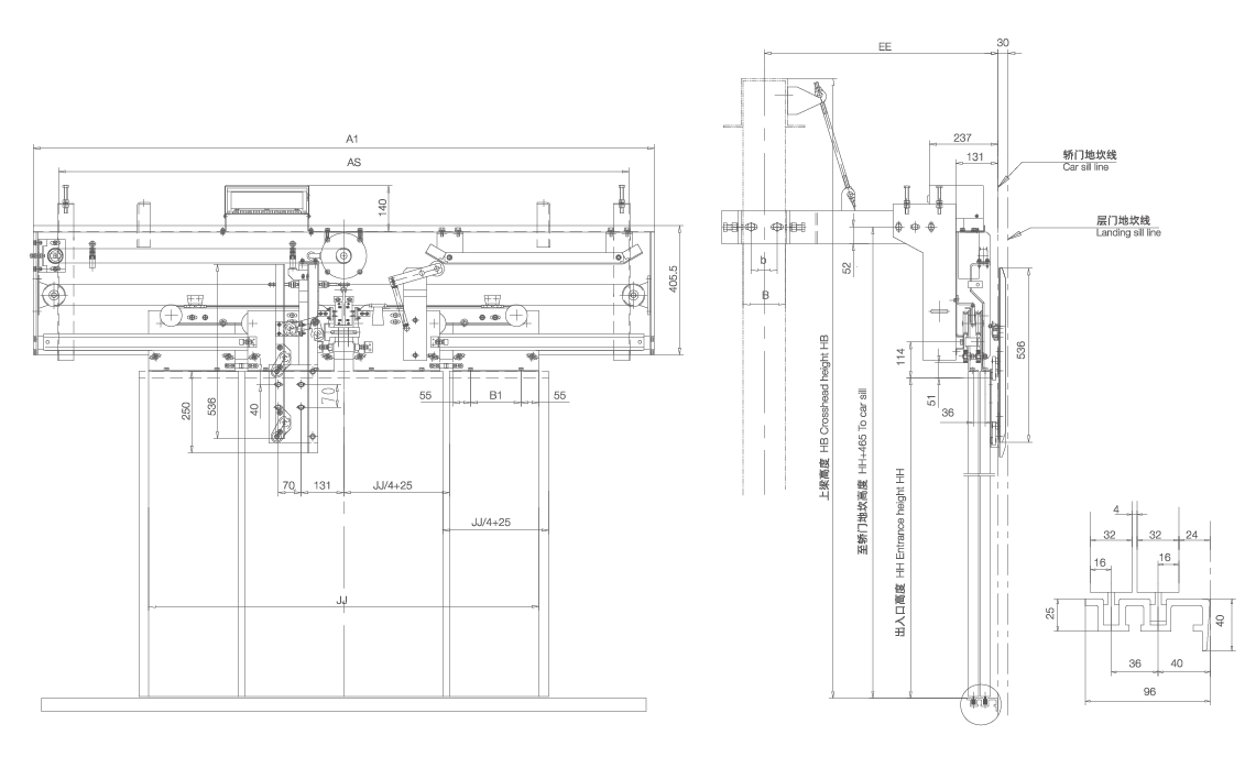 4、采用異步門刀;轎架、轎頂安裝方式